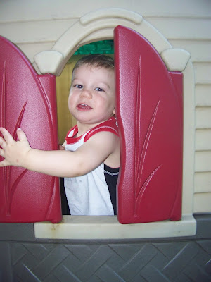 And all the brand new siding is on. Woo Hoo! Since Tom and I were outside a lot with the siding Ethan got to enjoy his new (to him) playhouse. He loves opening and closing the door and going in and out. Maybe occasionally pushing the doorbell. :)